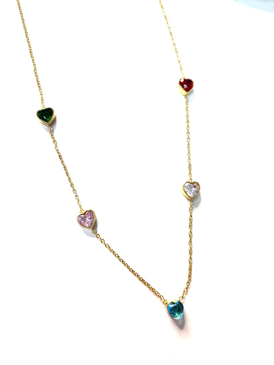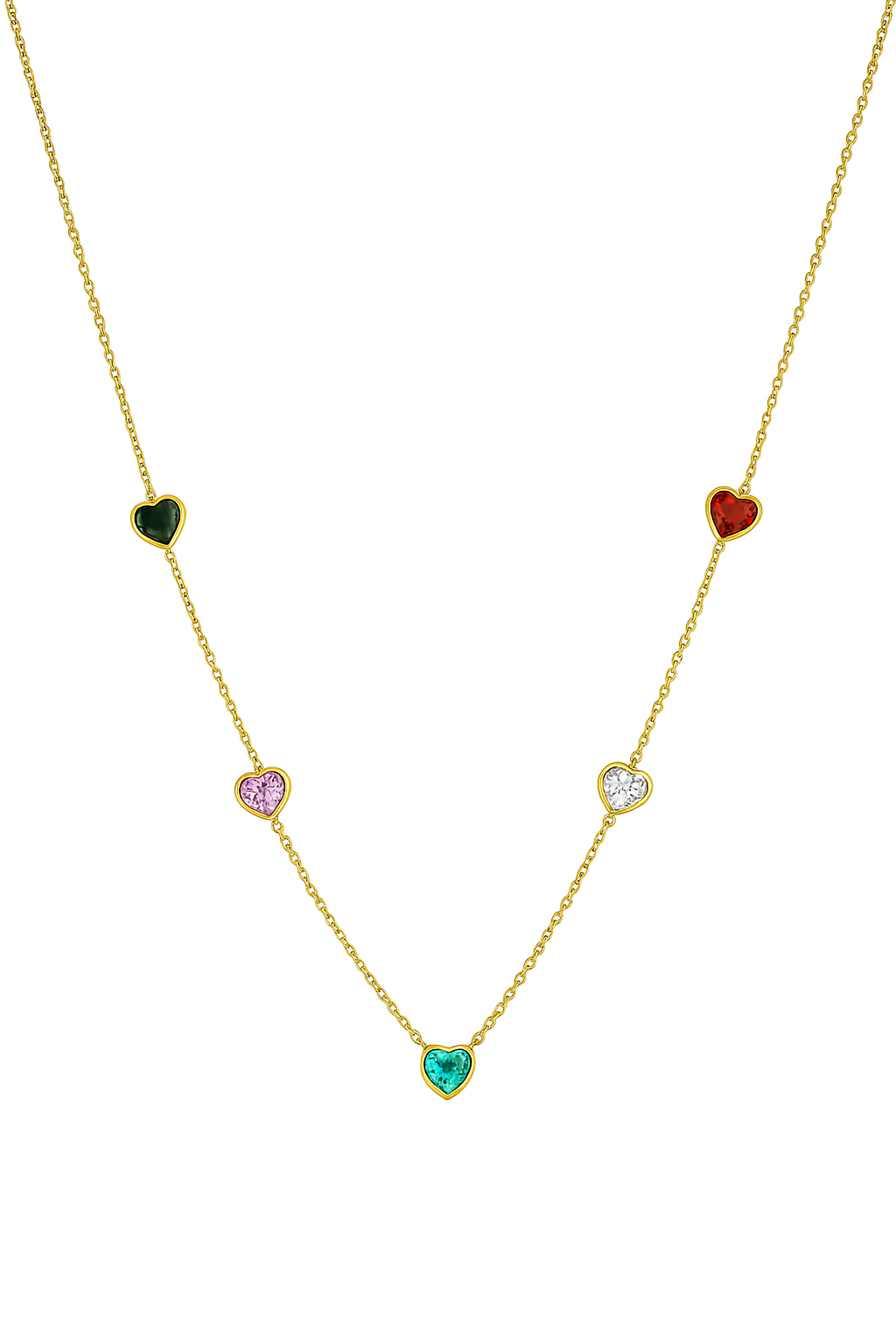 Add a pop of color and elegance to your everyday look with the Hearts in Harmony necklace by IRAZ. Crafted in high-polish gold plating, this statement piece features six heart-shaped charms in vibrant enamel and gemstone tones—emerald green, ruby red, pearl white, turquoise blue and blush pink. Each charm is evenly spaced for a balanced, eye-catching design. Lightweight and versatile, it’s perfect for layering or wearing solo. A must-have for those who love playful luxury with timeless charm.